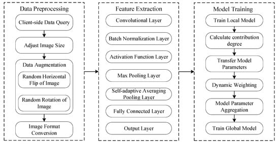 In the face of imbalanced data distributions, the averaging aggregation method adopted by FedAvg has limitations, and struggles to ensure accuracy; FedAvg-Data’s dataset weighting method overlooks the data quality and variety of each client, resulting in poorer results; and FedAvg-ContribData, merging dataset weights with a contribution–contribution analysis process, enhances performance. In contrast to FedAvg and FedAvg-Data, its respective rates of accuracy enhancement stand at 39.7% and 7.9%.