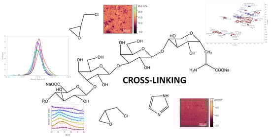 In the experiments in absence of I, where H was cross-linked with E at 1/1, 1/2, and 1/3 molar ratios, the respective obtained yields were 77%, 64%, and 42%. These results indicate that all the H-serine end groups were already fully involved in the reaction at 1/1 of the H/E ratio. This indicates that these conditions were optimal for the 1H/1E ratio to react with the serine-end group to produce the sequence: H-(1→4)-β-D-GlcA-(1→3)-β-D-Gal-(1→3)-β-D-Gal-(1→4)-β-D-Xyl-α-Ser-CH2-CH(OH)-CH2-OH, with the highest observed yield. At the ratio of 1H/2E, we expect that the product with the obtained 64% yield was likely: H-(1→4)-β-D-GlcA-(1→3)-β-D-Gal-(1→3)-β-D-Gal-(1→4)-β-D-Xyl-α-Ser-CH2-CH(OH)-CH2-O-CH2-CH(OH)-CH2-OH. Analogously, the 1H/3E ratio could produce the third 2-hydroxypropyl on the serine-end unit: H-(1→4)-β-D-GlcA-(1→3)-β-D-Gal-(1→3)-β-D-Gal-(1→4)-β-D-Xyl-α-Ser-CH2-CH(OH)-CH2-O-CH2-CH(OH)-CH2-O-CH2-CH(OH)-CH2-OH, which led to the obtained 42% yield.