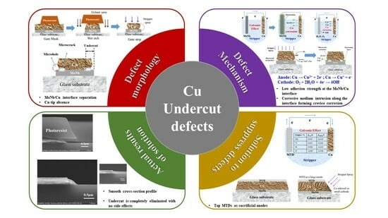 35]. Apart from the undercut phenomenon during wet etching, this defect may also occur in the stage of the photoresist (PR) stripping process. A Mo undercut was also found in Mo/Cu stacked electrodes during the PR wet stripping process by M. Chen et al. [