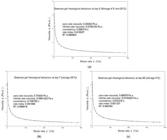 The rheological behavior of dextrose gels was also investigated using the flow sweep mode by applying different shear stresses to achieve the corresponding shear rate values. A representative flow curve obtained for dextrose gel on the day the batches were compounded (D0) exhibits the shear-thinning behavior of the gel with a rate index of 0.61, determined with the CROSS model (