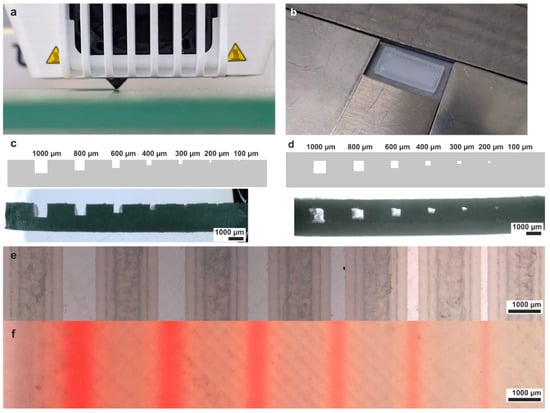 For evaluation of the channel resolution, a series of embedded square-shaped channels with different diameters were printed, cut with a precision saw, Diadisc 5200 (Mutronic, Rieden am Forggensee, Germany), and then polished with a diamond mill. The cross-section was analyzed by a light microscope of type VHX6000 (Keyence, Osaka, Japan).