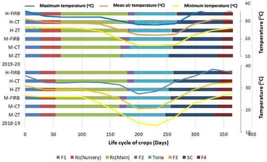 Crop/cropping system performance is a reflection of the integrated effects of the weather, soil, crops, and management practices. Of these, weather elements are beyond the control of the farmer. However, the timing of post-rice crop planting is crucial to the rice–toria–sweet corn system’s performance. Crop establishment can be modified to align the cropping system’s life cycle with a favorable weather window. Furthermore, the sowing time of post-rice crops is greatly dependent on the growth duration of the rice cultivar used in rice-based cropping systems. Very often, toria sowing is delayed due to the late harvesting of long-duration rice varieties; therefore, it is essential to find a rice cultivar that will provide the optimum sowing window for the succeeding non-rice crops to avoid heat stress due to adverse weather. Heat stress reduces mustard yields by decreasing the crop growth duration [4] and maize yields by affecting pollen viability [5]. It has been observed that dry-season crops planted after short-duration rice varieties perform better in terms of productivity and profitability in the winter [6].