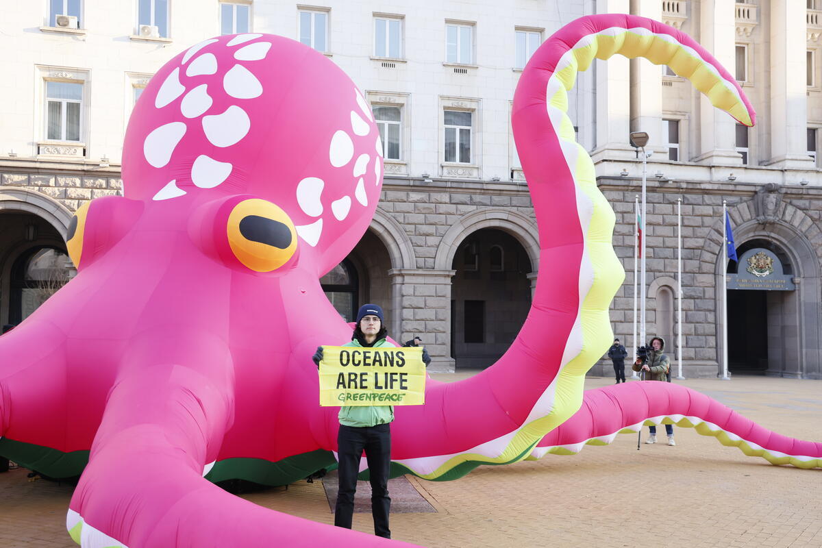 🇧🇬 Bulgaria – An activist stand with a banner and a giant octopus at the doorstep of the Bulgarian Council of Ministers. Greenpeace Bulgaria calls the Bulgarian government to ratify the Ocean Treaty now.