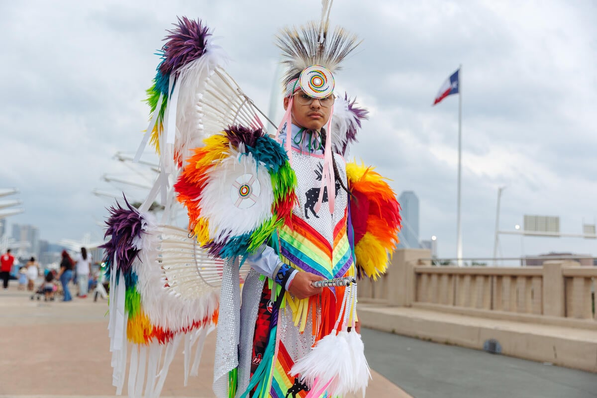 🇺🇸 Texas – A portrait of Dallas Indigenous dancer Desi in front of the Reunion Tower after a powerful sunset shoot capturing movement, regalia, and song as symbols of resistance and cultural strength.