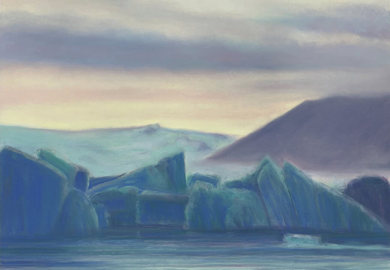 Schantz’s perspective encompasses a vast landscape. The geometric forms of the glaciers and icebergs emerge from a body of water, accompanied by looming mountain backdrops and overhanging clouds—all of which coalesce to emphasize the massive glacial forms. Soft blues, white, yellow and purple shades capture the subtleties of light in the region. Schantz is known for his landscape paintings, both of his home region of the Berkshires of western Massachusetts and of other sites around the world.