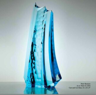 In contrast, Bremers, a Dutch artist and glass sculptor, focuses specifically on singular glacial forms. His glass shaping technique allows him to convey distinct details of the glacial surfaces with curvatures, ripples and crevices. The varying thickness of the transparent glass results in many changing shades of blue. The sculptures range in size from 20 to 40 inches high—with some weighing over 100 pounds. Bremers is also showing his glass sculptures at a solo exhibition, “Ice and Water,” at the Chrysler Museum in Norfolk, Virginia, marking a return to an earlier Iceberg series he started decades ago.