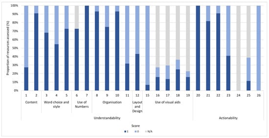 Figure 1 illustrates the distribution of PEMAT-P scores by item across resources. While all resources identified at least one actionable step (item 20), no resource made meaningful use of visual aids to prompt user action (item 26) and only 9% (2/22) did so to make content more easily understood (item 15).