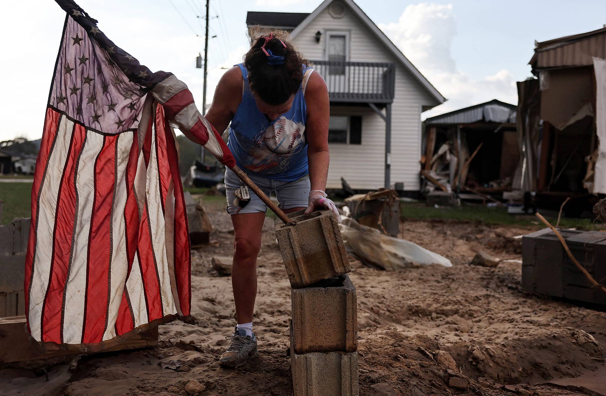 Roxanne Brooks mounts an American flag to a stack of cinderblocks outside her friend’s destroyed mobile home (at right) in the aftermath of Hurricane Helene flooding in Swannanoa, North Carolina.