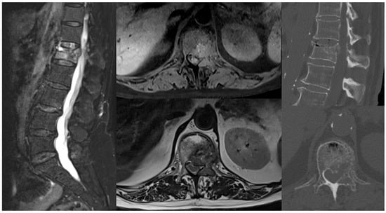 Nine years earlier, she had undergone a right quadrantectomy followed by adjuvant radiotherapy for luminal A breast cancer and therapy with anastrozole for five years. Five years later, due to a shift to a triple-negative histotype, she received a total mastectomy and subsequent chemotherapy with cyclophosphamide, methotrexate, and fluorouracil. At her last follow-up, five months prior to presentation, she was disease-free. Upon admission to the Neurosurgery Department, she was neurologically intact (ASIA E) but experienced stabbing back pain (NRS 9/10), particularly during ambulation, and L1 radicular pricking pain (NRS 6/10). EQ-5D VAS was used as a simple tool for general Quality-of-Life measures at baseline and during follow-up: the baseline score was 40. A total-body CT scan and lumbar MRI with contrast were conducted for restaging, revealing a pathological fracture at L1 with grade 2 anterolateral left epidural cord compression, epiconus displacement, and a lesion in the left acetabulum (