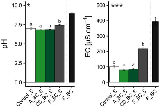 The control soil (Control_S) and the biochar-treated soils (F_BC_S, A_BC_S, and CC_BC_S) were analyzed for the following parameters: pH, electrical conductivity (EC), water holding capacity (WHC), soil organic matter (SOM), total carbon (TC), total nitrogen (TN), total phosphorus (TP), soluble phosphorus, available inorganic nitrogen (NH₄+-N and NO₃−-N), specific surface area (SSA), total pore volume, and pore radius. In addition, the biochar (F_BC) used to prepare the fresh biochar-amended soil for this study was also analyzed for pH, EC, and WHC, as well as SSA, total pore volume, and pore radius. It is important to underline that this is the same biochar that was used in 2010 for treating the soil, referred to in this study as A_BC_S. Furthermore, SSA, pore volume, and pore radius were also determined in two additional biochar samples, A_BC and CC_BC; these biochar samples were separated from a small amount of aged biochar-treated soils, A_BC_S and CC_BC_S, respectively.