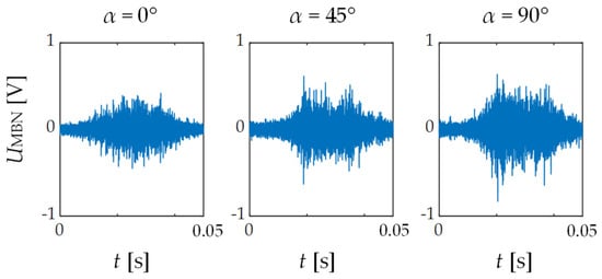 Figure 1) between successive Barkhausen effect activity stages occurring in the material and therefore requires advanced signal analysis methods sensitive enough to register those phases and enable quantitative assessment. Exemplary MBN signals registered for different magnetic directions (ascribed with different α angles) of GO steel are presented in
