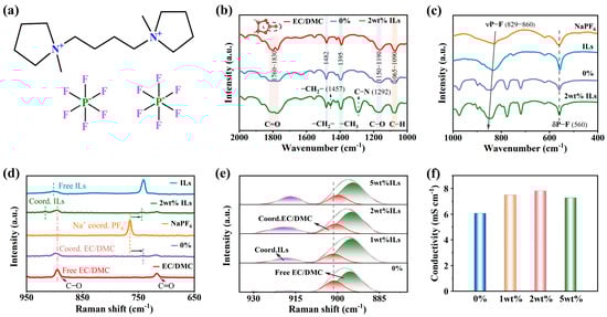 Figure 1a shows the structural diagram of C4di[mPy].di[PF6], where the cation structure is formed by connecting two methylpyrrolidine-cation groups together through an alkyl skeleton. The cation forms an ion pair with two PF6− ions through electrostatic interactions, forming a stable ionic liquid. The unique structure of C4di[mPy].di[PF6] directly influences the properties of the electrolyte. Firstly, the behavior and function of ILs in electrolytes were analyzed using FTIR spectra and Raman spectra. As shown in Figure 1b, 0% represents 1M NaPF6/EC:DMC (1:1) electrolyte, and 2 wt% ILs represents 1M NaPF6/EC:DMC (1:1) + 2 wt% C4di[mPy].di[PF6] electrolyte. It can be seen that the C=O peak in the EC/DMC solvent is relatively sharp. However, in the 0% and 2 wt% electrolyte, the C=O peak becomes broader, especially in the electrolyte containing 2 wt% ILs, which may be affected by the effect of hydrogen bonding. Meanwhile, it can be clearly seen from the IR spectra that after adding IL additives, obvious characteristic peaks appear at 1457 cm−1 and 1292 cm−1, corresponding to the -CH2– bond and C-N bond in C4di[mPy]2+, respectively, indicating that the IL additives have been uniformly dispersed in the electrolyte. Of particular note is that the characteristic peak located at 1292 cm−1 has a strong and relatively sharp intensity, indicating the presence of a large number of ionic liquid ions (N+) in the electrolyte, which is beneficial for improving the ionic conductivity of the electrolyte. As shown in Figure 1c, it was found that the addition of ILs resulted in a blue shift in the P-F stretching vibration peak at 829 cm−1, which demonstrated an enhanced interaction between Na+ and PF6−. As shown in Figure 1d, in the Raman spectra, after NaPF6 was dissociated in EC/DMC solvent and solvent containing 2 wt% ILs, the P-F peak in PF6− shifted from 765 cm−1 to 742 cm−1 and 745 cm−1, respectively. The displacement of the P-F peak in electrolyte containing 2 wt% ILs is slightly smaller, indicating that there is stronger binding between Na+ and PF6− than that in the electrolyte without ILs [28]. In addition, compared with the spectra of 0% electrolyte and EC/DMC solvent, it was found that the characteristic peak at 895 cm−1 undergoes a blue shift after EC/DMC solvent binding with Na+, indicating that Na+ and EC/DMC solvent have strong binding force. However, in the electrolyte containing 2 wt% ILs, the characteristic peak at this point shows almost no shift, indicating that the addition of ILs weakens the interaction between Na+ and EC/DMC solvent. Pure ILs have another characteristic peak at 902 cm−1, but this characteristic peak exhibits a blue shift in the electrolyte containing 2 wt% ILs, indicating a strong interaction between a certain component in the electrolyte and C4di[mPy].di[PF6]. From Figure 1e, it can be seen that as the concentration of ILs increases, the red shift of the characteristic peak of EC/DMC solvent at 895 cm−1 gradually increases, indicating that the interaction between Na+ and the EC/DMC gradually decreases. In addition, conductivity tests were carried out on different electrolytes (Figure 1f), and it can be seen that the ionic conductivity of the electrolyte was significantly increased by the addition of C4di[mPy].di[PF6]. Because ILs are composed of asymmetric anions and cations, the interaction between the ions is weak, so they can be completely dissociated into free anions and cations in organic solvents, thus enhancing the conductivity of the electrolyte [29,30].