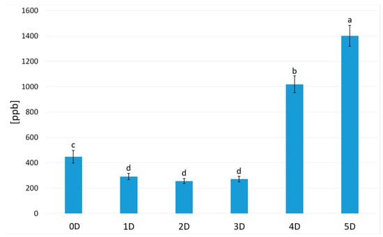 Most of the detected compounds belonged to the chemical group of aldehydes (nine compounds) and alcohols (five compounds). In the volatilome of hummus, three ketones, three pyrazines, one furan, and one terpene were also detected. The total concentration of volatiles in sample 0D was 448.03 ppb (Figure 1). Malts produced from chickpeas germinated for 24, 48, and 72 h were characterized by a lower concentration of volatiles, 291.15 ppb for 1D, 255.98 ppb for 2D, and 271.68 ppb for 3D. Germinating chickpeas by 96 or 120 h increased the total concentration of volatiles (1018.39 for 4D and 1401.67 ppb for 5D).