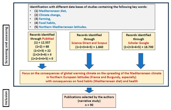 The early history of the earth includes the succession of cooling and warming periods with major changes for life: the disappearance, survival, and evolution of plant and animal species [1,2]. For the last 1000 years, in the temperate latitudes of Western Europe, there have been cyclic changes of 150–200-year periods, and the last one started around 100 years ago. Based on the consequences of global warming, within 50 years from now, it is supposed that the Mediterranean climate, currently observed around the Mediterranean Sea, could move to higher latitudes, especially in France [3,4]. Advances in proxy methods and interpretations pave the way for the use of past climates for model evaluation [5,6]. Unfortunately, the area currently characterized by a Mediterranean climate could progressively become semi-arid and arid, with several negative social and economic impacts on the countries concerned [3]. In the South of Europe, one of the major impacts of global warming notably concerns vine and corn cultivation; indeed, vines are sensitive to dehydration and warm and sunny days, and the cultivation of corn requires a high quantity of water [4]. This impact on vine growth has already had negative economic impacts in several wine regions in France. Conversely, in the highest latitudes of Europe, this situation of global warming could favor modifications to agricultural practices, with the development of new cultures (olives, pomegranates, almonds) and new white oak forests (https://www.oliveoiltimes.com/production/climate-change-leads-some-bordeaux-wine-producers-to-plant-olives/116924, accessed on 15 January 2025), and subsequently, new food habits. This could lead to an increased consumption of fruits and vegetables that are major compounds of the Mediterranean diet. The notion of the healthy diet began to emerge from 1950 to 1990 with the work of the American physiologist Ancel Keys, who looked at men in their 40s and 50s living in Greece (including Crete), the US, Finland, Japan, Italy, Yugoslavia, and the Netherlands. Ancel Keys showed that despite a diet very rich in fat (over 40% of their daily calorie intake came from olive oil in Greece), cardiovascular diseases that resulted in heart attacks and stroke in these countries were almost unheard of, cancer was even rarer, and an increase in lifespan in good health was, therefore, observed (https://borakisgreekfood.co.uk/pages/the-cretan-diet, accessed on 21 January 2025 and [7]). This pioneering work of Ancel Keys contributed to the notion of the Mediterranean diet and to the emergence of the work of Serge Renaud on the French paradox [8]. It is now widely admitted that the Mediterranean diet has several health benefits [9], and in association with the current environmental changes that have several negative aspects [10], some modifications of diet habits, including more Mediterranean compounds (vegetables, fruits), could be expected [11]. It is important to highlight that the so-called Mediterranean style of cooking is currently not restricted to the Mediterranean basin but is also found in other regions of the globe at the same latitude, between the 39th and 40th parallels from the northern and southern hemispheres, including California (USA) and certain regions of China, Chile, and South Africa [12,13]. Currently, to improve evidence for the health benefits of the Mediterranean diet, more systematic and quantitative approaches are still needed in research practice, and the applicability of the Mediterranean diet to non-Mediterranean countries has not been established. In addition, the Mediterranean diet also includes a lifestyle aspect, requiring the simultaneous consideration of other non-dietary behavioral factors when assessing its effects [14].