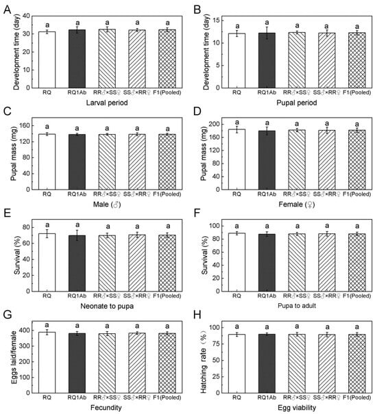 The male and female RQ1Ab moths were individually crossed with the unmated male and female RQ moths, and vice versa. The F1 hybrid offspring were backcrossed with RQ to obtain a sample size exceeding 50 because resistance to Cry1Ab exhibits incomplete recessiveness (refer to the section below). Biological assays were performed on RQ1Ab, RQ, reciprocal F1 hybrids, and backcrossed offspring to evaluate their sensitivities to Cry1Ab.