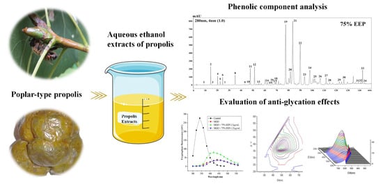 Propolis contains abundant phenolic compounds, which confer upon it a wide range of functional activities, such as antioxidant, anti-inflammatory, antimicrobial, antifungal, and anti-diabetic properties. Consequently, the identification of phenolic compounds in propolis is crucial for the comprehensive exploration of its potential properties. In this investigation, the phenolic composition of aqueous ethanol extracts of poplar-type propolis was analyzed utilizing HPLC-PDA. Figure 1 displays the HPLC chromatograms of propolis extracts obtained using different ethanol/water solvents, revealing notable variations. These chromatograms can be categorized into two distinct types. The first type, comprising WEP (Figure 1B) and 25% EEP (Figure 1C), exhibited a limited number of peaks mainly occurring prior to a retention time of 50 min. The second type encompasses 50% EEP (Figure 1D), 75% EEP (Figure 1A), 95% EEP (Figure 1E), and 100% EEP (Figure 1F), which exhibit a greater abundance of peaks within the retention time range of 50 to 140 min. The findings imply that ethanol concentrations of 50% or higher appear to facilitate the extraction of a broader range of components present in propolis, including flavonoids, phenolic acids, and their esters; in contrast, only phenolic acids present in WEP and 25% EEP, such as caffeic acid, p-coumaric acid, ferulic acid, isoferulic acid, and 3,4-dimethoxy cinnamic acid. The extraction efficiency of 75 wt.% ethanol/water was found to be the highest, as evidenced by the presence of the highest number of compound species and contents (Figure 1A). Specifically, 34 compounds, comprising 19 phenolic acids and their esters, 13 flavonoids, and 2 unsaturated hydrocarbons, were identified in the 75% EEP (Figure 1 and Table 1). Flavonoids were observed to be the predominant components in the 75% EEP, especially with pinobanksin-3-acetate, pinocembrin, chrysin, galangin, 5-methoxy pinobanksin, and pinobanksin. Among these, pinobanksin-3-O-acetate exhibited the highest content of 196.91 mg/g. The sum of the quantified 13 flavonoids exceeded 50% of the total weight. Previous literature has reported that flavonoid compounds such as chrysin, galangin, pinocembrin, pinobanksin and its ester derivatives exhibit strong antioxidant activities and are associated with reduced risk of various diseases, including heart disease, asthma, cancer, diabetes, and Alzheimer’s [25]. For instance, pinobanksin-3-cinnamate may provide neuroprotection through counteracting oxidative stress and has the potential to treat vascular dementia [26]. Pinocembrin has been shown to inhibit atherosclerosis progression by enhancing the level and function of endothelial progenitor cells [27]. Our previous research demonstrated that galangin and pinocembrin from propolis can improve insulin resistance in HepG2 cells [28]. Additionally, some flavonoids, such as quercetin and genistein, have been confirmed to inhibit AGEs [29]. Therefore, we speculated that the high content of flavonoids in the poplar-type propolis, including pinocembrin, chrysin, galangin and pinobanksin and its ester derivatives, etc., may be the primary trigger for its inhibitory effects against protein glycation.