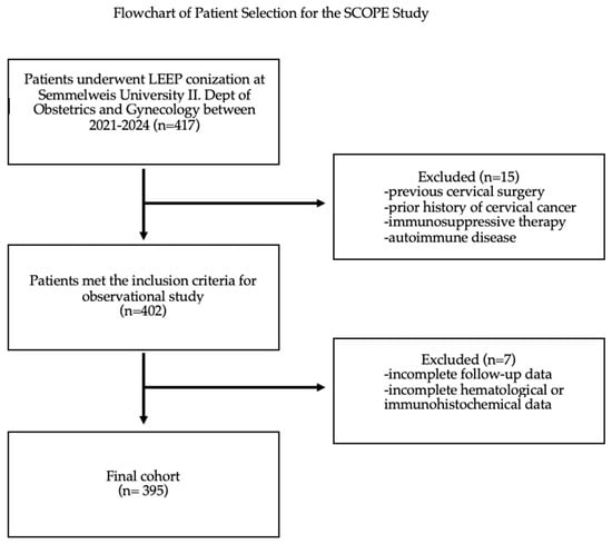 Patients were included in the study if they underwent LEEP conization at the Department of Obstetrics and Gynecology, Semmelweis University; had complete histopathological and hematological data, including NLR, PLR, MLR, and p16 immunohistochemical staining results; and were at least 18 years old at the time of the procedure.