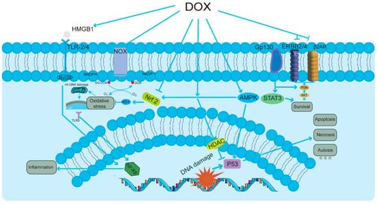 Nonetheless, a major challenge in the clinical application of DOX lies in its dose-dependent cardiotoxicity, posing a formidable limitation on its utilization [19,20,21]. One of the primary characteristics of doxorubicin-induced cardiotoxicity (DIC) (Figure 1) is the initiation of cellular responses in cardiomyocytes [22,23,24], which may lead to congestive heart failure. Among these pathways, the activation of the HMGB1/TLRs/NF-κB signaling pathway leads to heightened inflammatory responses. In parallel, the NOX/Nrf2/HO-1/ROS pathway plays a significant role in generating reactive oxygen species, thereby contributing to oxidative stress. Additionally, the AMPK/P53 pathway is responsible for inducing cell cycle arrest and apoptosis, while the PI3K/AKT/STAT3 pathway facilitates survival signaling. Together, these interrelated processes result in oxidative stress, mitochondrial DNA dysfunction, increased inflammation, and various forms of cell death, including apoptosis, necrosis, and autophagic cell death (autosis), ultimately affecting tissue homeostasis and function, as shown in Figure 1. This adverse effect not only diminishes the quality of life for cancer patients but also significantly increases the risk of mortality. Among these deleterious effects, mitochondrial damage stands out as particularly pronounced [25,26]. DOX first accumulates in the mitochondria of cardiomyocytes, where it binds to the phospholipid cardiolipin in the inner mitochondrial membrane, blocking the electron transport chain and inhibiting the function of complexes I and II, leading to a significant increase in reactive oxygen species (ROS). Excessive production of ROS disrupts the mitochondrial membrane lipids, which further leads to mitochondrial dysfunction and cell death [27,28]. DOX binds to DNA and topoisomerase 2β (Top2β) to form the Top2–DOX–DNA cleavage complex, which triggers cell death [29]. The inhibition of Top2β, an enzyme specific to cardiac mitochondria, leads to further disruption of mitochondrial structure and function [30]. Moreover, a novel type of cell death, “iron death” (Ferroptosis), is also involved in DIC [31]. DOX upregulates heme oxygenase 1, releasing free iron and forming an active iron–DOX complex, which further promotes the oxidation of mitochondrial membrane lipids, leading to cell death [32]. Autophagy is an important mechanism by which cells remove damaged mitochondria and maintain homeostasis [33]. DOX affects the PI3Kγ pathway and activates the PI3Kγ/Akt/mTOR cascade by inhibiting autophagic flux and suppressing the autophagy initiation process, thus further exacerbating the impairment of mitochondrial function [34]. DOX-mediated ROS production and lipid peroxidation can alter the activity of membrane proteins, such as mitochondrial calcium channels, thereby affecting Ca2+ homeostasis and signaling [35,36]. In addition, DOX impairs the expression and activity of myocardial sarcoplasmic reticulum ryanodine receptor 2 (RyR2) and sarcoplasmic reticulum Ca2+-ATPase (SERCA2), major participants in myocardial contraction, further reducing myocardial contractility [37,38]. In conclusion, the primary features of DOX’s dose-dependent cardiotoxicity include the impairment of cardiac mitochondrial function, which involves several facets of ROS production, the inhibition of Top2β, induction of iron death, the inhibition of autophagic flux, and the disturbance of Ca2+ homeostasis. Together, these interrelated pathways cause damage to cardiomyocytes and a reduction in heart function.