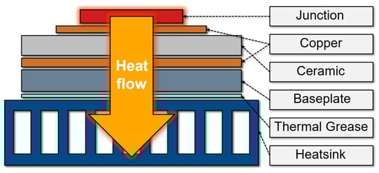 Additionally, the thermographic data and the NTC sensor data were sampled at different intervals. Specifically, the thermographic camera recorded the surface temperatures of each component (HT, LT, HD, LD) at an average interval of approximately 20 ms, whereas the NTC sensors measured the heatsink temperature at 100 µs intervals and provided an averaged value each second. To align these two datasets on a common time base, a linear interpolation was performed, resulting in a unified time resolution of 0.1 ms. This interpolation ensured a consistent comparison of temperature data collected from the infrared camera and the NTC sensors.