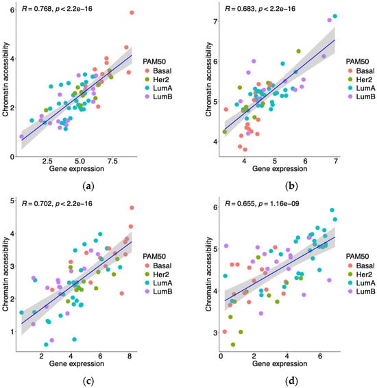 RNA-seq and ATAC-seq data from 68 matched GDC TCGA-BRCA patients were used for the integrative analysis. Genes and peaks with low variability, specifically a median gene expression ≤ 1 and median peak signal ≤ 1, were excluded. A Spearman correlation analysis was conducted to examine the relationship between gene expression and chromatin accessibility at promoter regions in the matched patients. Correlations with a coefficient ≥ 0.65 and a p-value < 0.01 were considered significant.