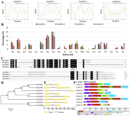 Since the origin and evolution of CeLEA5 genes were not well resolved by above phylogenetic analysis, a similar approach was also used to identify homologs from 33 representative plant species, which include the basal angiosperm Amborella trichopoda, four core eudicots, 25 core monocots, and three early diverged monocots that did not experience the τ WGD, i.e., Acorus gramineus, eelgrass (Zostera marina), and duckweed (Spirodela polyrhiza) [40,41]. As shown in Table S2, a single member was not only identified in A. trichopoda, a rare example without any recent whole-genome duplication (WGD), but also in eelgrass, duckweed, apostasia (Dendrobium catenatum), and Dioscorea alata, though they were proven to have undergone at least one recent WGD after monocot radiation [40,41,42]. By contrast, 2–6 members were found in other species (Table S2), implying the monogenic origin of the LEA_5 family followed by lineage-specific expansion.