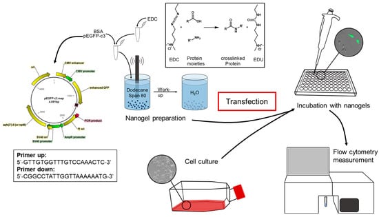 The uptake of nucleic acids into living cells with the aim to provide them with extra genetic information, e.g., for the recombinant production of foreign proteins, is an essential experimental task in cell biology. A variety of tools and techniques for this process known as transfection has been invented in recent decades [7,42]. In addition to chemical compounds as transfection facilitators like cationic polymers [14], calcium phosphate [16], or cationic lipids [15], a category in which the reference transfection agent Lipofectamine used here can be subsumed, different classes of nanoparticles have been described including gold nanoparticles [43], organically modified silica (ORMOSIL) nanoparticles [42,44], biologically degradable polymer nanoparticles (i.e., poly(lactic acid)) [45]; poly(β-amino ester) [46]), or chitosan-based nanoparticles [47]. With the recent introduction of inverse-nanoemulsion-derived BSA nanohydrogels, we have added a simple protein-based nanoparticle to the available portfolio of cell uptake-mediating nanostructures [34]. The existing robust and simple synthesis protocol for these nanogels was shown here to allow for easy experimental modification by simply adding increasing amounts of plasmid DNA as an example of functional nucleic acids without disturbing the nanogel quality delivering indistinguishable key parameters like size, swelling, agglomeration behavior, and zeta-potential. These NanoTrans-gels can be stored in a ready-to-use manner in simple TRIS·HCl buffer (pH 7.4) at 4 °C, and addition to the target cells allows for conditions resembling those of standard transfection protocols as they are used, e.g., with Lipofectamine (i.e., incubation time, temperature, expression time, etc.). The principal functionality of transfection with calcium phosphate nanoparticles has been shown, but a large study with a variety of cells found that this method resulted in notoriously low reproducibility of transfection efficiencies generally below those obtained with the commercial DOSPA/DOPE transfection agent Lipofectamine 2000 [24,48]. Lipofectamine has been optimized with the introduction of Lipofectamine 3000, which is a kit that contains a lipid mixture and a so-called P3000 reagent with a composition that is not fully known. However, this has been claimed by the manufacturer and described in a series of studies to improve transfection efficiencies for a range of different cell lines including “hard to transfect” cells like A549 [49,50,51,52,53]. In the context of such a technological breakthrough, it is of special remarkability that the inverse-nanoemulsion-derived BSA/EDC nanohydrogels, as carriers of DNA in our preliminary study using, so far, protocols that are not further optimized, instantaneously allowed for improvements in A549 transfection efficiencies of up to 95-fold compared to Lipofectamine 3000/P 3000 dependent protocols as the reference. Differences in transfection efficiencies principally depend on genetic and cell physiological conditions and are influenced by a vast variety of parameters that are hard to control in experiments. The respective nucleic acids have to cross the cell membrane, escape from the lysosome, and then enter the nucleus thereby—most importantly—avoiding their degradation [54,55,56,57,58,59,60,61]. Without yet having strong experimental evidence for increased protection of the nucleic acid when it is on the way from the membrane to the expressed marker gene(s), the speculation appears to be reasonable that DNA molecules tightly cocooned in a protein-based hydrogel may be stored extremely safely against (enzymatic) degradation like in a molecular secure container. If degradation-prone inactivation of functional vectors in a hard-to-transfect cell line like A549 is a crucial parameter, in turn, a hydrogel-mediated stabilization may explain the drastic effect observed for this cell line. However, the particle uptake, the release of cargo DNA, and its fate until the expression of the transfected phenotypes require more detailed analyses, which will be part of a follow-up study also involving more cell lines and different cargo DNAs. Deeply appreciating the common perception that the complex physiological process of transfection requires optimized conditions for every potential target cell line [62,63], we dare to hope that the NanoTrans-gel concept may develop into a broadly applicable, novel, and valuable expansion of the portfolio of transfection technologies available in cell biology.