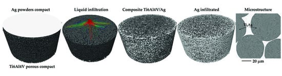 As demonstrated, the Ti6Al4V/Ag combination is suitable for use in biomedical implants; however, it has a weakness in the density levels that it presents once sintered, which is a serious problem that compromises the life of a prosthesis. This can be solved with techniques such as gravity infiltration, thus being able to improve the mechanical properties without neglecting the antibacterial part. Since this option has not yet been studied, the selection of this technique allows it to be developed in its entirety. Therefore, the main objective of this work is to analyze the infiltration process from the point of view of the void space to be filled by liquid. Thus, porous compacts with different pore characteristics were prepared to evaluate the flow throughout the porosity with the aim of fabricating Ti6Al4V/Ag composites that could be used as bone implants. Additionally, a microstructural characterization and mechanical properties were evaluated in order to determine the viability for use them as orthopedic implants.