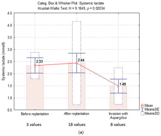 To compare the parameters across the three analyzed intervals (before replantation, after replantation, and during massive Aspergillus invasion), the Kruskal–Wallis H test was applied. The Mann–Whitney U test was used to compare lactate levels in the limb between the post-replantation period and the stage of Aspergillus invasion.