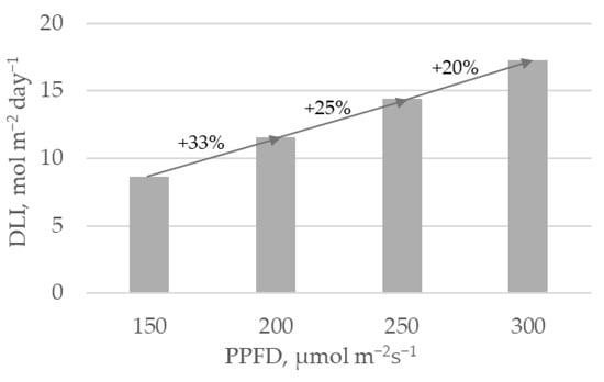 −1. Daily light integral (DLI) represents the cumulative amount of light in the PAR region that plants receive within a 24 h period and is expressed in moles of photons and incident per square meter per day (mol m