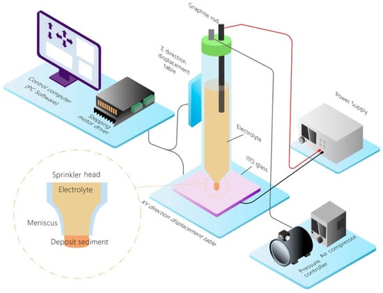 The electrochemical deposition method described in this paper relies on charge transfer reactions at the electrode–solution interface. A regulated DC power supply, wires, anodes, cathodes, and electrolytes form a complete circuit. The electrochemical reactions are governed by thermodynamics and kinetics, which influence the rate and direction of reactions.