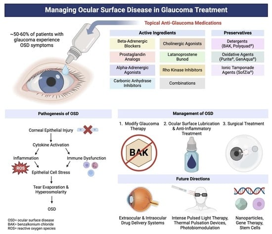| Patients with POAG, pseudoexfoliation glaucoma, pigment dispersion glaucoma, or OHT on topical anti-glaucoma medications | This prospective observational study assessed OSDI in 630 patients with POAG, pseudoexfoliation glaucoma, pigment dispersion glaucoma, or OHT who were on topical IOP-lowering medications. | 305 patients (48.4%) had an OSDI score indicating either mild, moderate, or severe OSD symptoms. Higher OSDI scores were observed in patients using multiple IOP-lowering medications (p = 0.0001). | Fechtner et al. USA, 2010 [47] |
