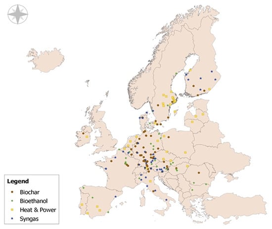 23]. In contrast, bioethanol plants are more evenly distributed but are primarily located in Central Europe. Combined heat and power (CHP) plants and gasifiers, on the other hand, are notably concentrated in regions with extensive forestry land and significant industrial activity, where they serve to meet local energy needs while contributing to carbon footprint reduction through carbon-neutral energy sources.