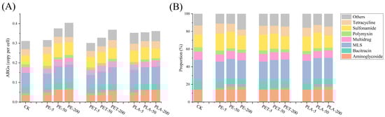 Metagenomic analysis was conducted to comprehensively explore the impact of PE, PET, and PLA-MPs on the abundance of ARGs throughout the AD process of SS. A total of 26 types of ARGs were detected within the AD system. Among these, macrolide–lincosamide–streptogramin (MLS), aminoglycoside, bacitracin, multidrug, polymyxin, sulfonamide, and tetracycline resistance genes were identified as the predominant ARG types (Figure 1). Exposure to PE, PET, and PLA resulted in significant increases in the relative abundance of ARGs at varying levels compared to the control without MPs (one-way ANOVA, F = 23.257, p < 0.05), with a general trend of increased total ARG abundance correlating with higher concentrations of these MPs, particularly at 200 mg/L for PE and PET. In the control group, the total relative abundance of ARGs was 0.311 copies per cell. Under PE exposure, the total relative abundance of ARGs increased to 0.316 copies per cell at 5 mg/L, 0.375 copies per cell at 50 mg/L, and 0.404 copies per cell at 200 mg/L, marking a maximum increase of 29.90%. Under PET exposure, the total abundance of ARGs decreased to 0.301 copies per cell at 5 mg/L but rose to 0.328 copies per cell at 50 mg/L and 0.369 copies per cell at 200 mg/L, achieving a maximum increase of 18.64%. Under PLA exposure, the total relative abundance of ARGs increased to 0.362 copies per cell at 5 mg/L, decreased to 0.355 copies per cell at 50 mg/L, and further to 0.353 copies per cell at 200 mg/L, with a maximum increase of 14.15%. Similar results indicated that Zhang et al. found the relative abundance of eARGs of the eight tests was 1.70 times and 2.15 times that of the control group, respectively, with the exposure of microplastic fibers during sludge anaerobic digestion [34]. Luo et al. found that compared with the control group, the MPs with ARGs abundance in the range of 10~80 particles/g-TS were dose-dependent, and the relative abundance of ARGs increased by 4.5~27.9% [35].