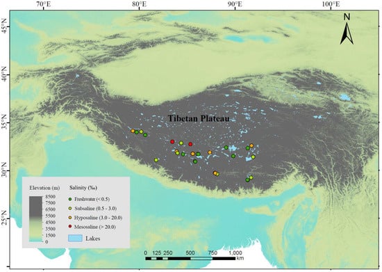 37]), and lake depths range between 3.8 and 55.7 m, with an average of 21.4 m. The vegetation in most areas consists mainly of alpine meadows or shrubs, with little to no trees around the lakes, or only sparse small plants. The sampled lakes included 9 freshwater lakes (salinity < 0.5‰) and 16 saline lakes. The saline lakes can be further categorized into 8 subsaline lakes (salinity = 0.5‰~3‰), 6 hyposaline lakes (salinity = 3‰~20‰), and 2 mesosaline lakes (salinity > 20‰) (