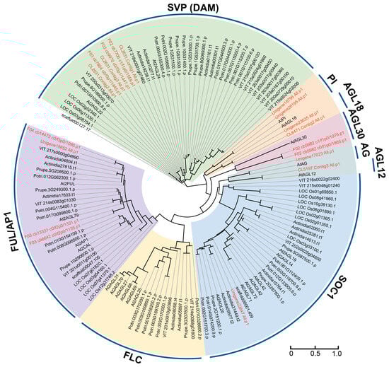 C genes are grouped into 12 phylogenetic clades, including AP1/FUL, SOC1, AG, SVP, AGL15 (AGL18), AP3/PI, SEP, AGL6, FLC, BS, AGL12, and AGL17 [