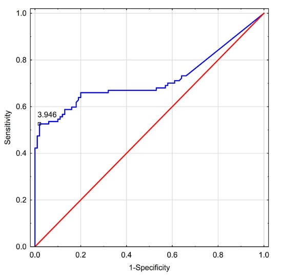 59]. In our study group, the diagnostic accuracy of PLT was modest, with an AUC of 0.646. On the other hand, mean platelet volume (MPV) was characterized by the highest diagnostic accuracy among assessed hematological markers (0.842), and its value was significantly higher in the course of NAFLD than in the control group. Simultaneously, we did not observe any notable correlations between MPV and other parameters investigated in the survey. However, it is worth emphasizing that already obtained general data on MPV highlight its role in the increased probability of cardiovascular complications among NAFLD patients (e.g., atherosclerosis, thrombosis, stroke and myocardial infarction) [