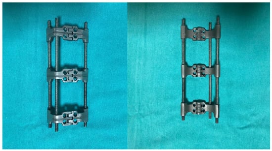 The study aimed to obtain a more biomechanically robust implant design than the existing fixation methods. The previous fixation methods were considered in the implant design and their deficiencies were evaluated. In this way, the developed implant consisted of three large clamps and provided proper containment according to the bone’s dimensions. There are three M6 screw holes in each clamp; two locked cortical screws are used in the proximal and distal clamps. The implant is supported by three rods that reduce the load on the fractured area and transfer the load to the other parts of the bone. The clamps prevent axial shifts in the fractured part of the bone and ensure that most of the force is transmitted through the rods (