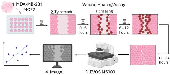 63]. We first captured images of the monolayer wounds at the zero-hour mark and subsequently recorded hourly images along the wound edge for a total of 12 h. This allowed us to identify the “Optimal Time” (OT). Additionally, we took pictures after 24 h to assess the percentage of wound closure—effectively allowing the measurement of the migration efficacy endpoint—using the EVOS M5000 fluorescent imaging system (Thermo Fisher Scientific, Waltham, MA, USA) (