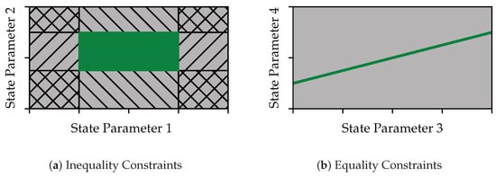 One option is the introduction of equality constraints , where a specific combination of state parameters must permanently be satisfied. An example of equality constraints could be the specification of a relatively shallow working depth for stubble cultivation, in contrast to a high working depth for primary tillage. Another option is restricting the optimization space by introducing inequality constraints . These constraints determine that specific state parameters or parameter combinations must be within a specified optimization scope. Typical inequality constraints are, for example, speed limitations (minimum/maximum) during tillage operations. This ensures the functionality of the implement and, consequently, the effective execution of the process.