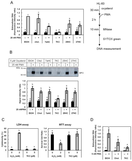 The following biological materials were procured commercially: 7α-hydroxycholesterol (7αHC) was from FOCUS Biomolecules (Plymouth Meeting, PA, USA); 7-ketocholesterol (7KC) and 25-hydroxycholesterol (25HC) were from Cayman Chemicals (Ann Arbor, MN, USA); 27-Hydroxycholesterol (27HC) was from Sigma-Aldrich (St. Louis, MO, USA); deutelium-labeled 7-ketocholesterol-22 (7KC-d7) was from Santa Cruz Biotechnology (Santa Cruz, CA, USA); Micrococcal nucleases were from Takara Bio Inc. (Shiga, Japan); polyclonal rabbit anti-myeloperoxidase (MPO; A0398) antibody was from Dako (Carpinteria, CA, USA); polyclonal rabbit anti-glyceraldehyde-3-phosphate dehydrogenase (GAPDH; G9545) antibody was from Sigma-Aldrich (St. Louis, MO, USA); SYTOX Green was from Thermo Fisher Scientific (Waltham, MA, USA); the Cytotoxicity LDH Assay Kit-WST was from Dojindo (Kumamoto, Japan); and the MTT Cell Count Kit was from Nacalai Tesque (Kyoto, Japan). All other chemicals were of analytical grade and were obtained from Sigma-Aldrich, Fuji Film Wako (Osaka, Japan), or Nacalai Tesque (Kyoto, Japan).