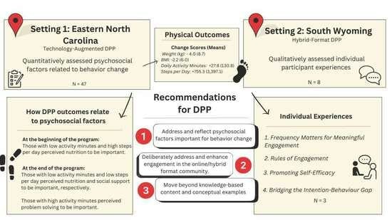 The Hybrid-Format DPP began with 13 participants (9 female, 4 male), and the average age was 46 (range 35–65 years). At baseline, the mean weight was 236.8 lbs. (SD = 79.4; range 152–457 lbs.), and the mean physical activity minutes was 204.7 (SD = 159; range 0–445 min). Eight participants completed the program (6 female, 2 male) and identified as White and Not Hispanic or Latino/a. In addition, all participants who completed the program completed an undergraduate degree. At endpoint, the mean weight was 271.3 lbs. (SD = 76.1; range 198–446 lbs.) and the mean physical activity minutes was 116.5 (SD = 90.5; range 0–280 min). The Hybrid-Format DPP participant baseline weight (236.8 compared to 199.1 lbs.) and physical activity (204.7 compared to 17.5 min) and endpoint weight (271.3 compared to 190.7 lbs.) and physical activity (116.5 compared to 45.3 min) were higher than in the Technology-Augmented DPP (setting 1) (see