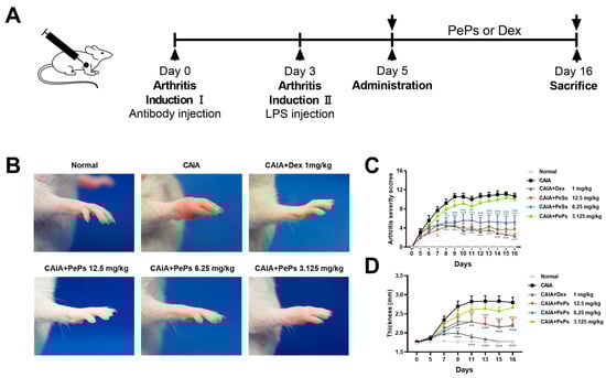 The utilization of the CAIA model in mice offers a direct and effective method for exploring the fundamental mechanisms implicated in rheumatoid arthritis pathogenesis, as well as facilitating the screening of potential therapeutic agents [11]. In light of our previous research findings, the primary objective of this study is to evaluate the therapeutic efficacy of PePs in the treatment of CAIA through the modulation of macrophage polarization in an in vivo setting, thus building upon our existing findings. Furthermore, we seek to simulate the process of polarization using RAW264.7 cells in vitro, aiming to investigate the specific impact of PePs on macrophage polarization.