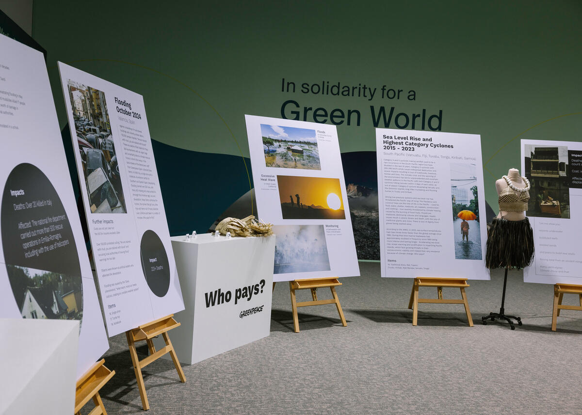 Representatives of Greenpeace at the 29th United Nations Climate Change Conference brought objects and remains of recent climate impacts experienced in Pacific islands, Brazil, the Philippines, Austria, Italy, Belgium, Indonesia, South Africa, Cameroon and Spain.