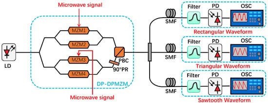 A proof-of-concept experiment was carried out to validate the proposed scheme. An optical carrier at 1550 nm, emitted from an LD, was injected into a commercial DP-DPMZM. Two microwave sources were used for modulation in the experiment to ensure the generation of different waveforms. A sinusoidal signal generated by a microwave signal generator was applied to the MZM1, and a sinusoidal signal was applied to the MZM3. The phase difference between and is zero. After passing through an optical bandpass filter, we acquired two distinct and orthogonal +1st-order sidebands, along with the optical carrier. By applying the optical signal to an optical spectrum analyzer with a resolution of 0.01 nm, the optical spectrum of the modulated optical signal was obtained. The output optical signal was detected utilizing a high-speed photodetector with 3 dB bandwidth of 70 GHz. Subsequently, the electrical signals produced by the photodetector were fed into both an electrical spectrum analyzer and an oscilloscope. The 40 GHz electrical spectrum analyzer was employed to measure the electrical spectra, while the oscilloscope showed the desired microwave waveforms, including triangular, rectangular, and sawtooth waveforms.