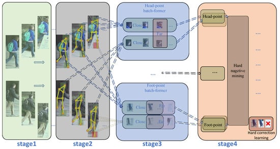 Pose-guided partial-attention is a network architecture that uses pose information extracted by a pose estimator to guide the attention mechanism, aiming to enhance the model’s understanding of local pedestrian features and mitigate the impact of occlusions. Batch information refers to utilizing the relationships among images within the same training batch to enhance feature learning, especially in the context of feature learning for key-point regions of pedestrians. The overall framework of the model is shown in