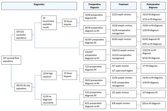 In 39 cases, a biopsy was performed after a successful synovial fluid aspiration with an inconclusive result. These biopsies were performed when there was a discrepancy between the initial clinical suspicion of PJI and the aspiration results. In our study, biopsy cultures after an inconclusive joint aspiration changed the preoperative diagnosis in 7/39 cases. Hassebrock et al. described the role of repeat synovial fluid aspiration for diagnosing PJI. They found that a second synovial fluid aspiration additionally diagnosed PJI in 6/30 cases and ruled out PJI in 2/30 cases. Thus, a second joint aspiration accurately changed the preoperative diagnosis in 8/60 cases, which is lower than our findings [