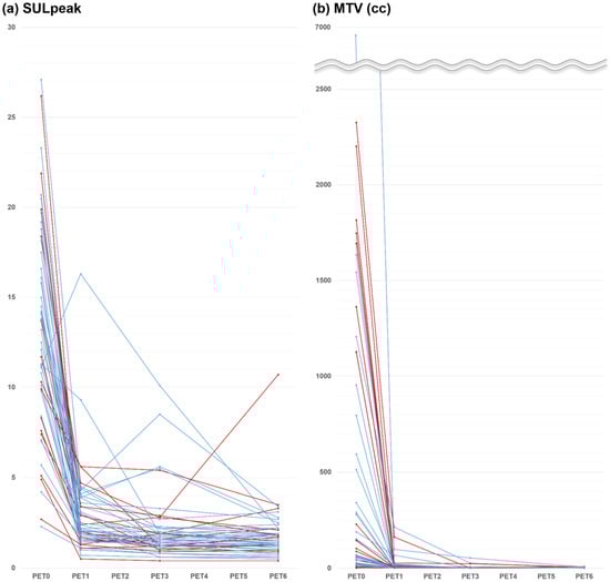 12]. We also measured the metabolic tumor volume (MTV) of all lymphoma lesions, and average of 1.5 × SUL + 2 standard deviation (SD) in the liver was used to define each threshold. The percent changes in SULpeak and MTV at early interim between PET0 and PET1 (%ΔSUL1 and %ΔMTV1), at interim between PET0 and PET3 (%ΔSUL3 and %ΔMTV3), and at end of therapy between PET0 and PET6 (%ΔSUL6 and %ΔMTV6) were calculated. SULpeak and MTV were measured independently, and the measurements were repeated when the numbers were not equal.