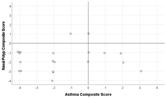 Figure 1 reports the scatter plot illustrating the distribution of asthma and CRSwNP nasal composite scores. Spearman’s rank correlation resulted in rho = −0.011, a substantially null correlation (