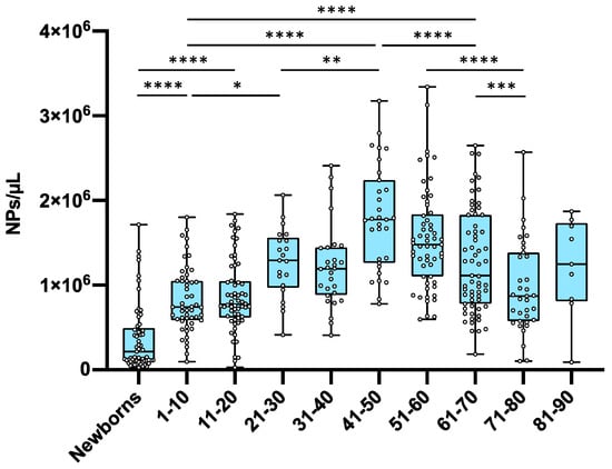41]. We analyzed blood samples from 61 newborns and detected the presence of NPs in each case, suggesting in utero or early life exposure, and subsequent accumulation and later decline warrant further investigation. The studied newborns exhibited the lowest NP levels compared to all of the other age groups,