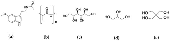 44], it was found that in the present case the sought hormone delivery switch (sleep onset/sleep maintenance) was easier to achieve, mainly due to the difference in the relative number of hydrogen bonds between the C5-OMe H-bond acceptor moiety in melatonin and the H-bond donor OH groups in the PLA-sorbitol, PLA-glycerol, and PLA-pentaerythritol copolymers, respectively.